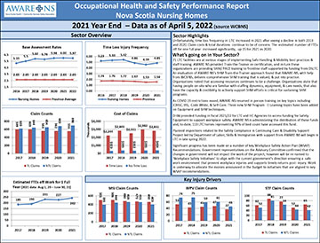 These reports provide a point-in-time snapshot of OHS performance for each sector based on data from the Workers’ Compensation Board of Nova Scotia (WCB). The data reflects time loss and no time loss claims reported to the WCB for each and their related costs and lost time days. Each report provides claim count information for three specific types of claims, those related to musculoskeletal injuries, workplace violence, and slips trips and falls.